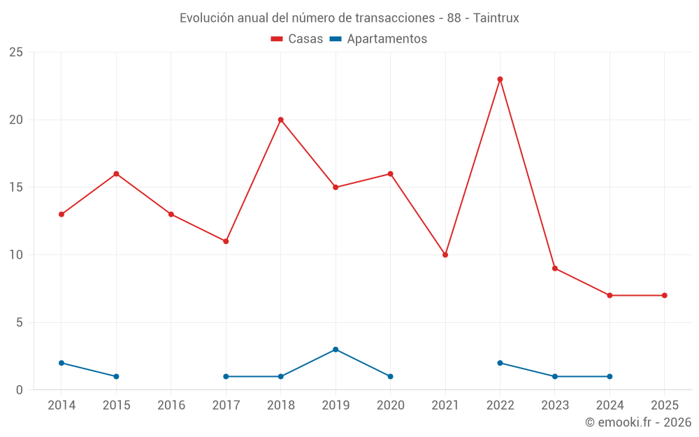 El precio mediano en las 17 transacciones de casas de los últimos 24 meses en la comuna de Taintrux fue de 1 569 € por metro cuadrado para un valor patrimonial medio de 167 500 €. Durante este período el 60% de las transacciones estuvieron entre 1 025 y 1 977 € por metro cuadrado (del 2º al 8º decil).