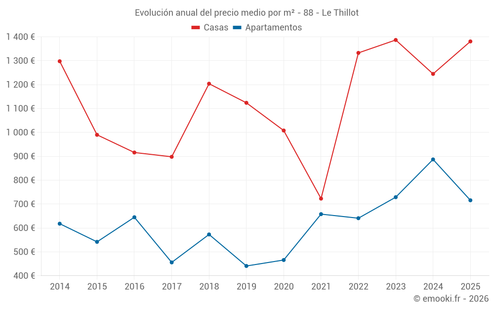 El precio mediano en las 19 transacciones de apartamentos de los últimos 24 meses en la comuna de Le Thillot fue de 844 € por metro cuadrado para un valor patrimonial medio de 89 685 €. Durante este período el 60% de las transacciones estuvieron entre 576 y 1 298 € por metro cuadrado (del 2º al 8º decil).