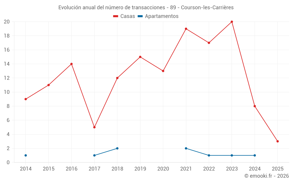 El precio mediano en las 17 transacciones de casas de los últimos 24 meses en la comuna de Courson-les-Carrières fue de 836 € por metro cuadrado para un valor patrimonial medio de 58 960 €. Durante este período el 60% de las transacciones estuvieron entre 556 y 1 007 € por metro cuadrado (del 2º al 8º decil).