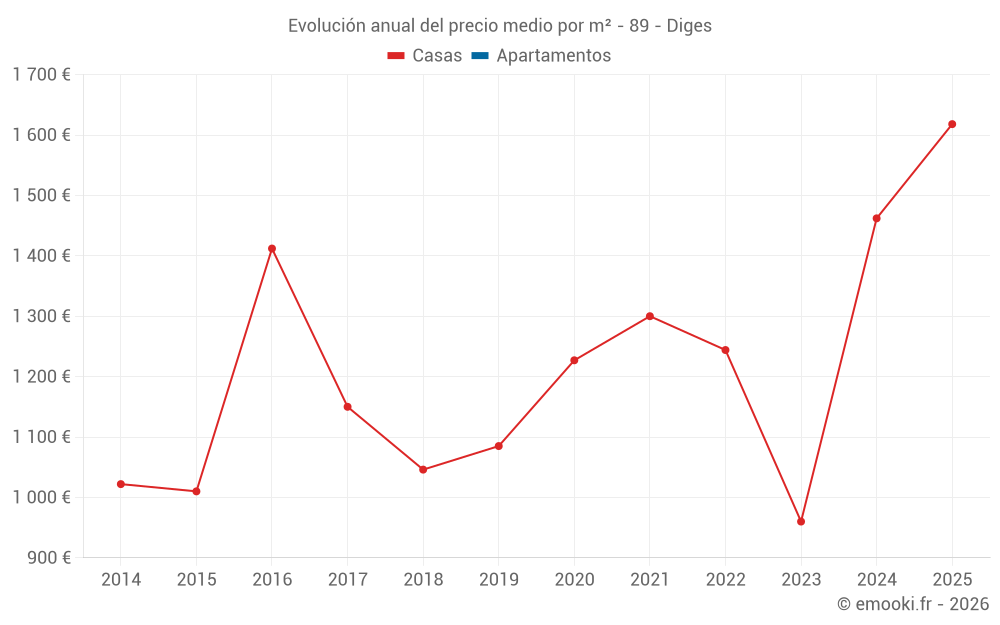 El precio mediano en las 18 transacciones de casas de los últimos 24 meses en la comuna de Diges fue de 1 423 € por metro cuadrado para un valor patrimonial medio de 108 500 €. Durante este período el 60% de las transacciones estuvieron entre 747 y 1 843 € por metro cuadrado (del 2º al 8º decil).
