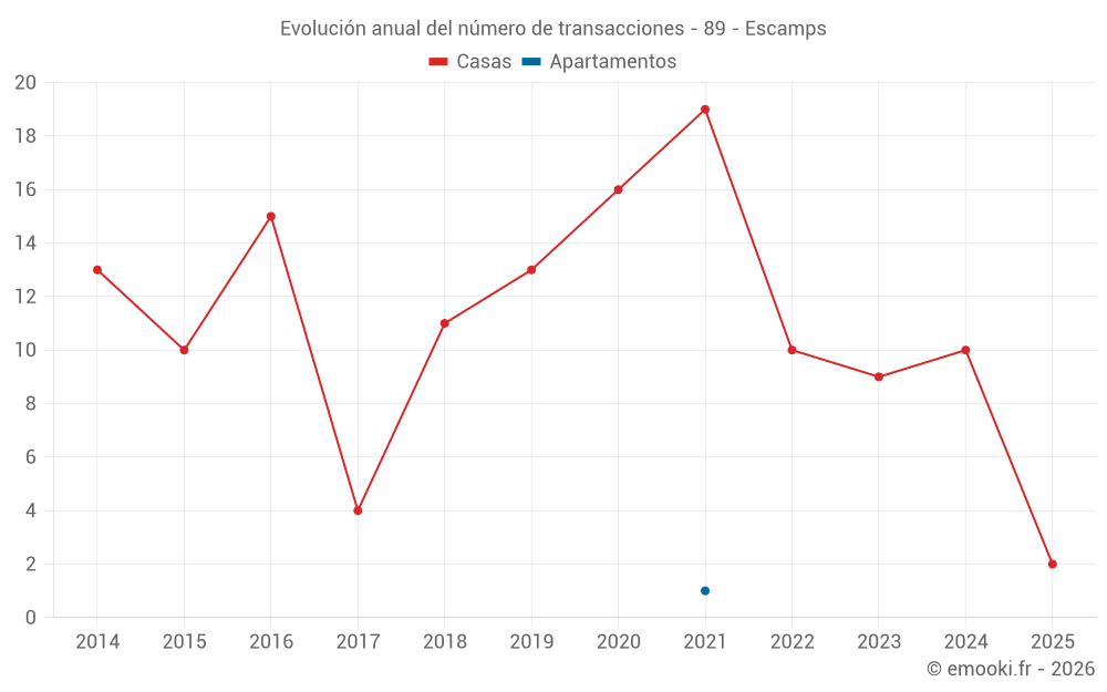 El precio mediano en las 16 transacciones de casas de los últimos 24 meses en la comuna de Escamps fue de 1 478 € por metro cuadrado para un valor patrimonial medio de 158 500 €. Durante este período el 60% de las transacciones estuvieron entre 798 y 1 784 € por metro cuadrado (del 2º al 8º decil).