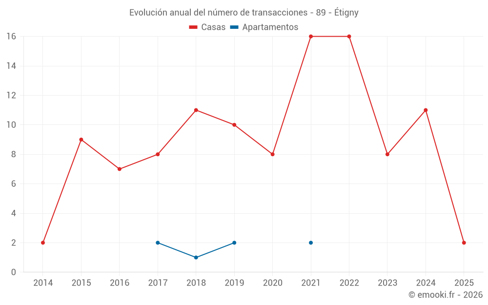 El precio mediano en las 16 transacciones de casas de los últimos 24 meses en la comuna de Étigny fue de 1 788 € por metro cuadrado para un valor patrimonial medio de 144 725 €. Durante este período el 60% de las transacciones estuvieron entre 1 410 y 2 113 € por metro cuadrado (del 2º al 8º decil).