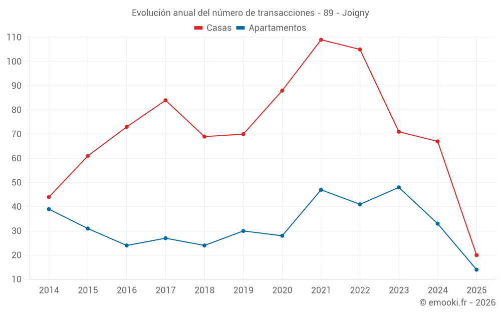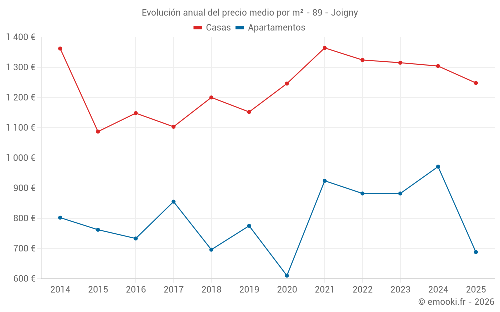 El precio mediano en las 20 transacciones de casas de los últimos 6 meses en la comuna de Joigny fue de 1 248 € por metro cuadrado para un valor patrimonial medio de 92 000 €. Durante este período el 60% de las transacciones estuvieron entre 1 019 y 1 581 € por metro cuadrado (del 2º al 8º decil).