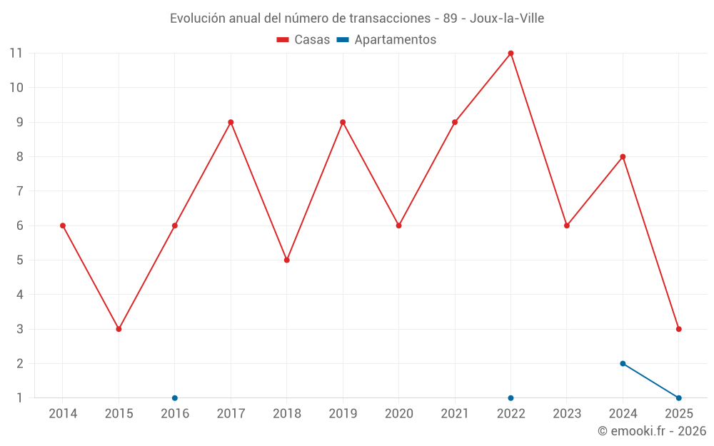 El precio mediano en las 15 transacciones de casas de los últimos 24 meses en la comuna de Joux-la-Ville fue de 969 € por metro cuadrado para un valor patrimonial medio de 86 900 €. Durante este período el 60% de las transacciones estuvieron entre 776 y 1 329 € por metro cuadrado (del 2º al 8º decil).