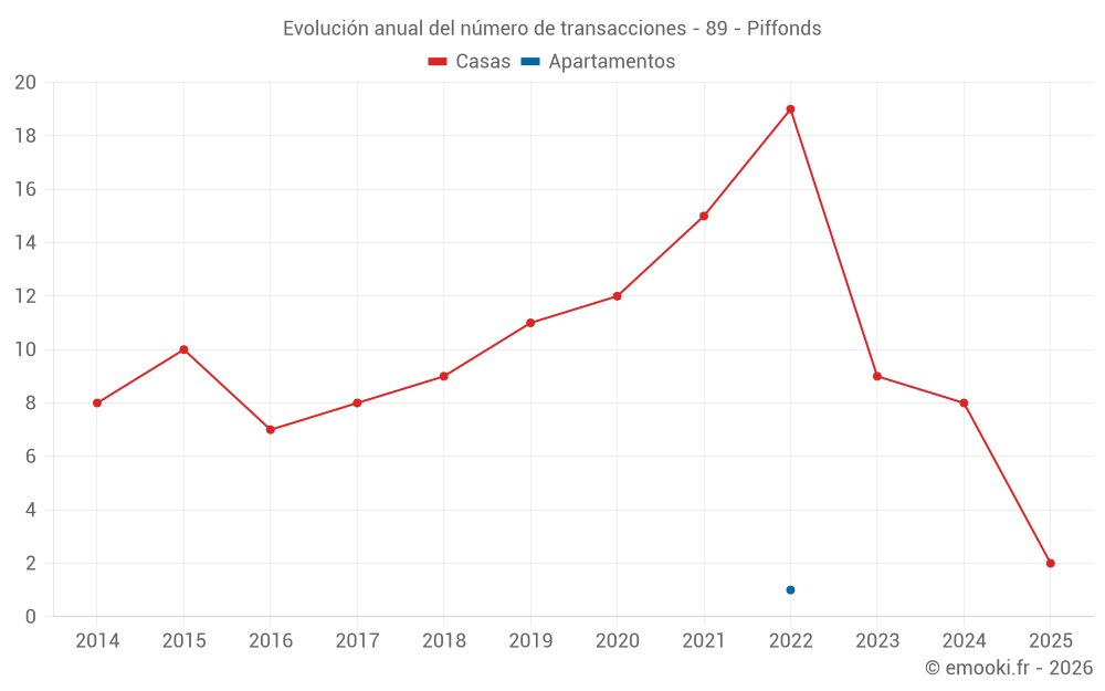 El precio mediano en las 14 transacciones de casas de los últimos 24 meses en la comuna de Piffonds fue de 1 188 € por metro cuadrado para un valor patrimonial medio de 129 500 €. Durante este período el 60% de las transacciones estuvieron entre 990 y 1 442 € por metro cuadrado (del 2º al 8º decil).