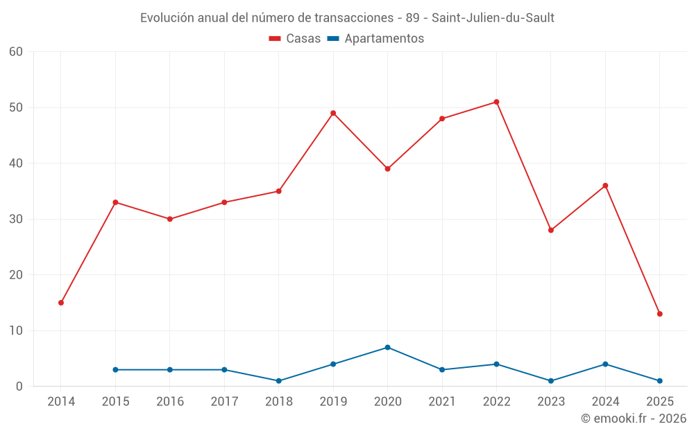 El precio mediano en las 30 transacciones de casas de los últimos 12 meses en la comuna de Saint-Julien-du-Sault fue de 1 160 € por metro cuadrado para un valor patrimonial medio de 106 750 €. Durante este período el 60% de las transacciones estuvieron entre 809 y 1 841 € por metro cuadrado (del 2º al 8º decil).