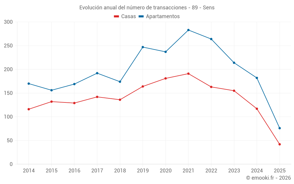 El precio mediano en las 28 transacciones de apartamentos de los últimos 3 meses en la comuna de Sens fue de 1 724 € por metro cuadrado para un valor patrimonial medio de 88 000 €. Durante este período el 60% de las transacciones estuvieron entre 1 323 y 2 031 € por metro cuadrado (del 2º al 8º decil).