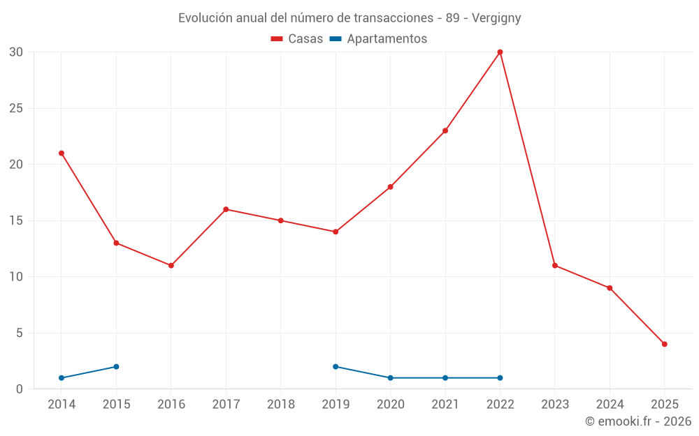 El precio mediano en las 18 transacciones de casas de los últimos 24 meses en la comuna de Vergigny fue de 1 420 € por metro cuadrado para un valor patrimonial medio de 120 000 €. Durante este período el 60% de las transacciones estuvieron entre 775 y 1 666 € por metro cuadrado (del 2º al 8º decil).