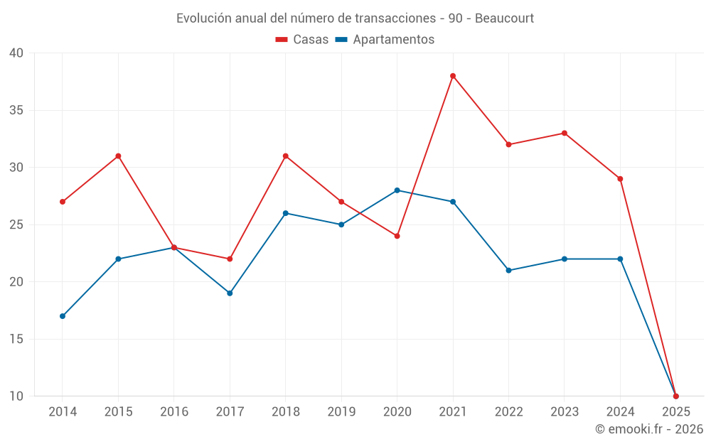 El precio mediano en las 19 transacciones de apartamentos de los últimos 12 meses en la comuna de Beaucourt fue de 1 113 € por metro cuadrado para un valor patrimonial medio de 85 000 €. Durante este período el 60% de las transacciones estuvieron entre 771 y 1 454 € por metro cuadrado (del 2º al 8º decil).
