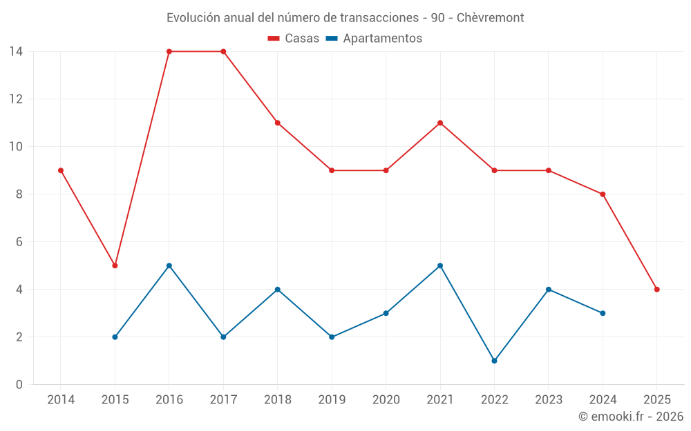 El precio mediano en las 18 transacciones de casas de los últimos 24 meses en la comuna de Chèvremont fue de 2 082 € por metro cuadrado para un valor patrimonial medio de 253 600 €. Durante este período el 60% de las transacciones estuvieron entre 1 876 y 2 511 € por metro cuadrado (del 2º al 8º decil).