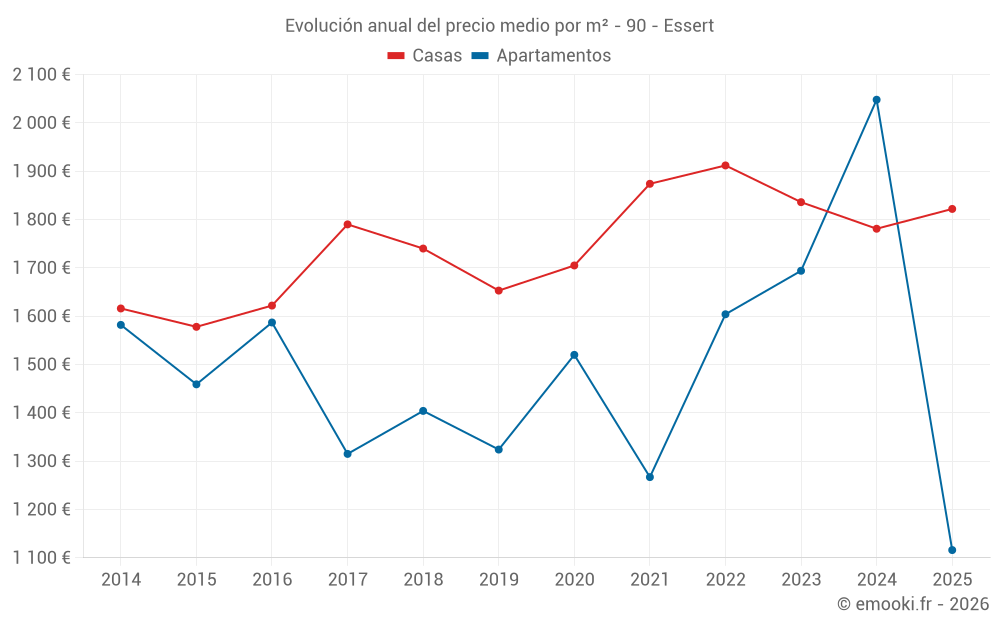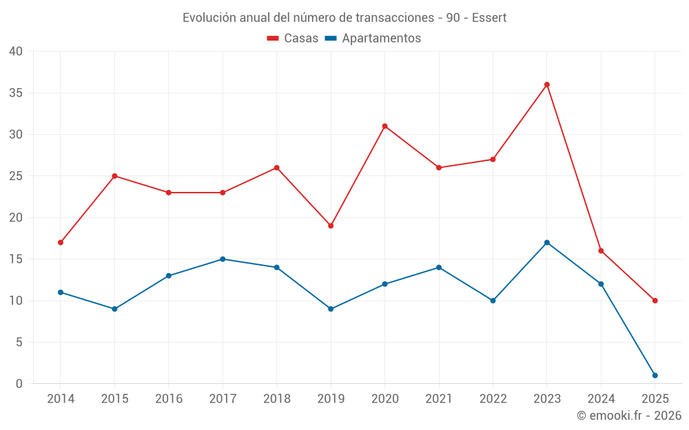 El precio mediano en las 22 transacciones de casas de los últimos 12 meses en la comuna de Essert fue de 1 802 € por metro cuadrado para un valor patrimonial medio de 231 700 €. Durante este período el 60% de las transacciones estuvieron entre 1 305 y 2 031 € por metro cuadrado (del 2º al 8º decil).