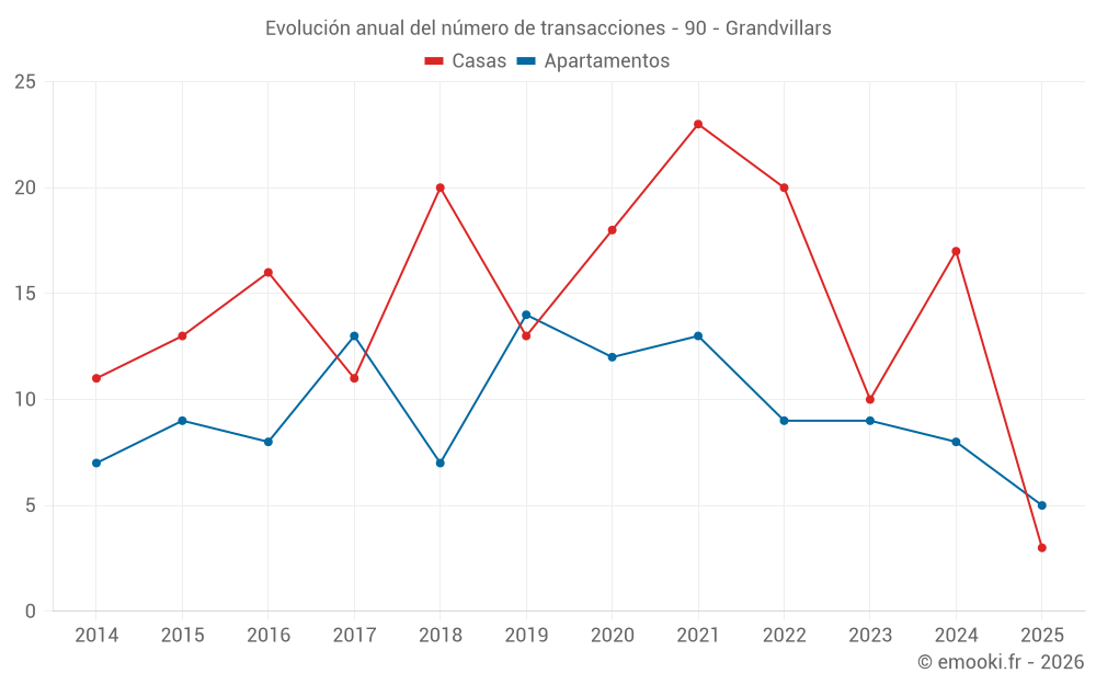 El precio mediano en las 19 transacciones de apartamentos de los últimos 24 meses en la comuna de Grandvillars fue de 1 111 € por metro cuadrado para un valor patrimonial medio de 101 000 €. Durante este período el 60% de las transacciones estuvieron entre 848 y 1 671 € por metro cuadrado (del 2º al 8º decil).