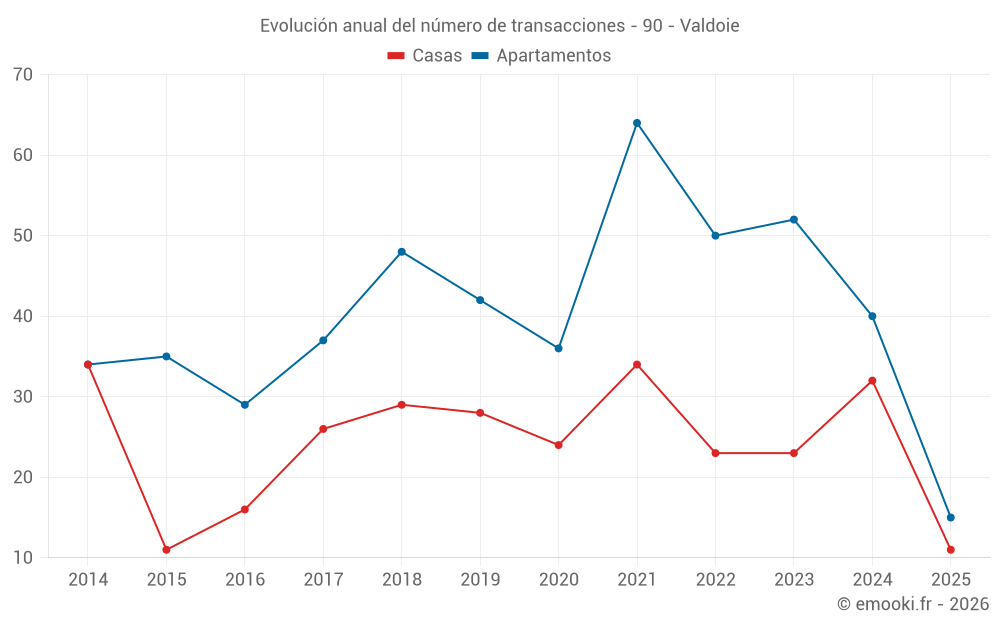 El precio mediano en las 35 transacciones de apartamentos de los últimos 12 meses en la comuna de Valdoie fue de 1 053 € por metro cuadrado para un valor patrimonial medio de 88 000 €. Durante este período el 60% de las transacciones estuvieron entre 869 y 1 414 € por metro cuadrado (del 2º al 8º decil).