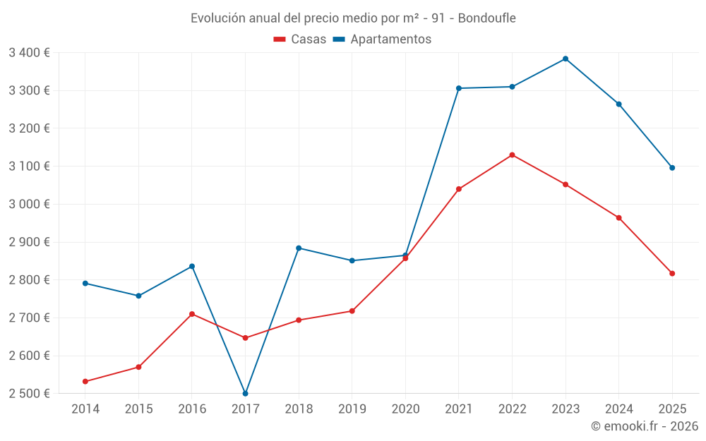 El precio mediano en las 45 transacciones de apartamentos de los últimos 12 meses en la comuna de Bondoufle fue de 3 249 € por metro cuadrado para un valor patrimonial medio de 182 280 €. Durante este período el 60% de las transacciones estuvieron entre 3 051 y 3 525 € por metro cuadrado (del 2º al 8º decil).