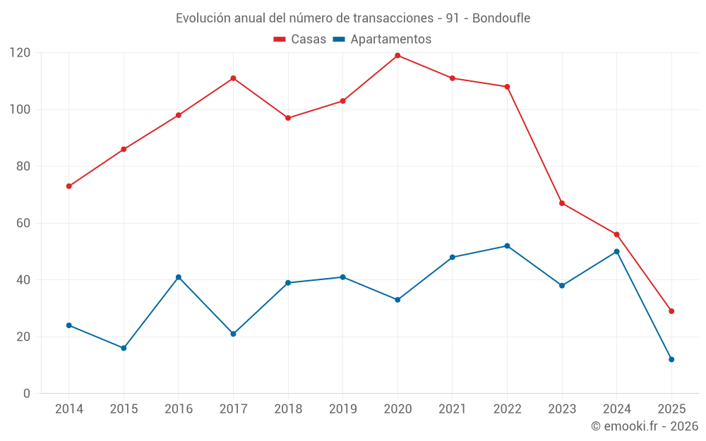 El precio mediano en las 29 transacciones de casas de los últimos 6 meses en la comuna de Bondoufle fue de 2 817 € por metro cuadrado para un valor patrimonial medio de 250 000 €. Durante este período el 60% de las transacciones estuvieron entre 2 360 y 3 111 € por metro cuadrado (del 2º al 8º decil).