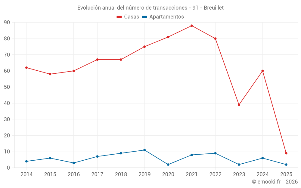 El precio mediano en las 41 transacciones de casas de los últimos 12 meses en la comuna de Breuillet fue de 2 853 € por metro cuadrado para un valor patrimonial medio de 268 100 €. Durante este período el 60% de las transacciones estuvieron entre 2 398 y 3 219 € por metro cuadrado (del 2º al 8º decil).