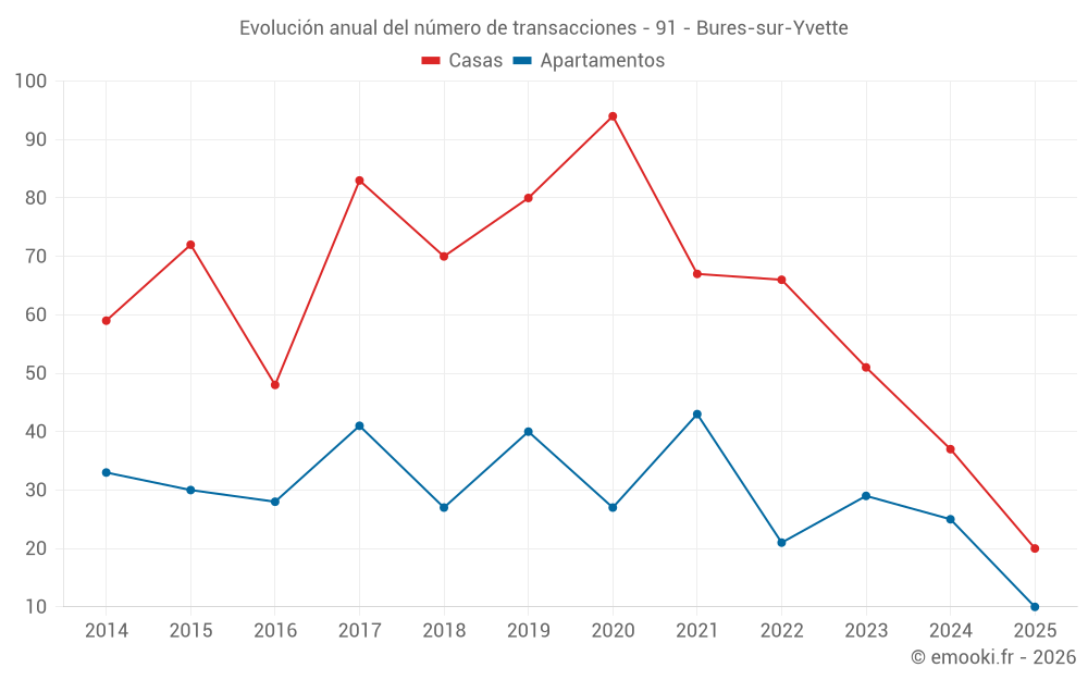 El precio mediano en las 20 transacciones de casas de los últimos 6 meses en la comuna de Bures-sur-Yvette fue de 3 772 € por metro cuadrado para un valor patrimonial medio de 429 000 €. Durante este período el 60% de las transacciones estuvieron entre 2 885 y 4 731 € por metro cuadrado (del 2º al 8º decil).