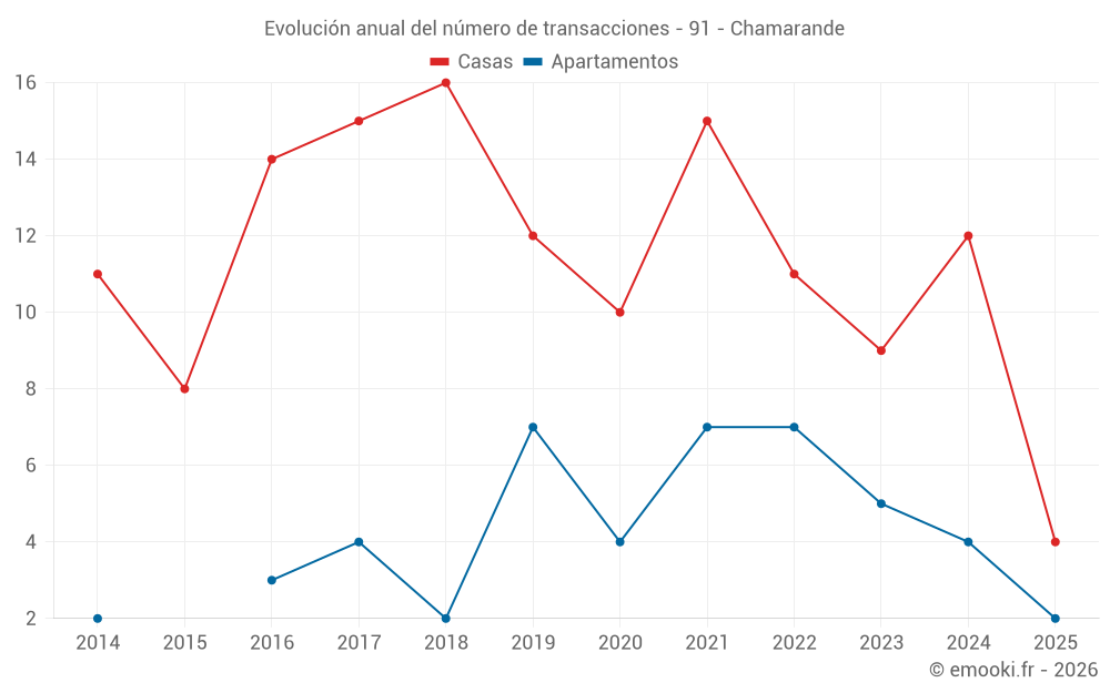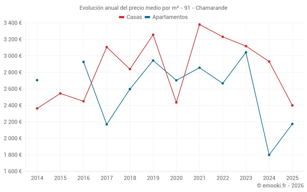 El precio mediano en las 23 transacciones de casas de los últimos 24 meses en la comuna de Chamarande fue de 2 927 € por metro cuadrado para un valor patrimonial medio de 278 000 €. Durante este período el 60% de las transacciones estuvieron entre 1 933 y 3 345 € por metro cuadrado (del 2º al 8º decil).
