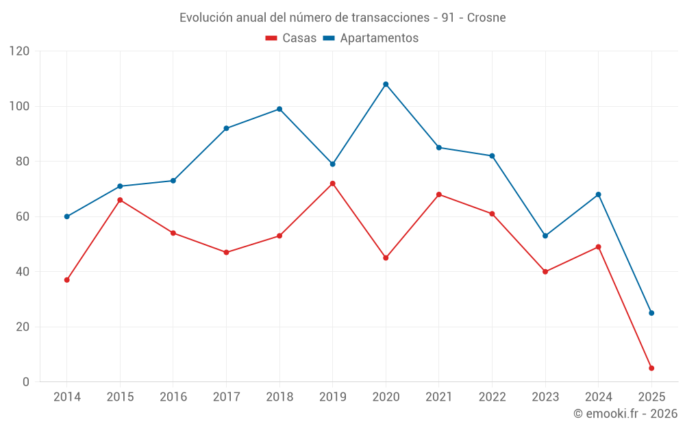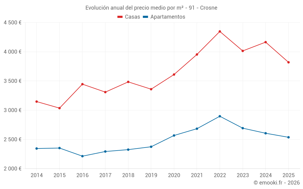 El precio mediano en las 25 transacciones de apartamentos de los últimos 6 meses en la comuna de Crosne fue de 2 537 € por metro cuadrado para un valor patrimonial medio de 158 000 €. Durante este período el 60% de las transacciones estuvieron entre 2 344 y 3 205 € por metro cuadrado (del 2º al 8º decil).