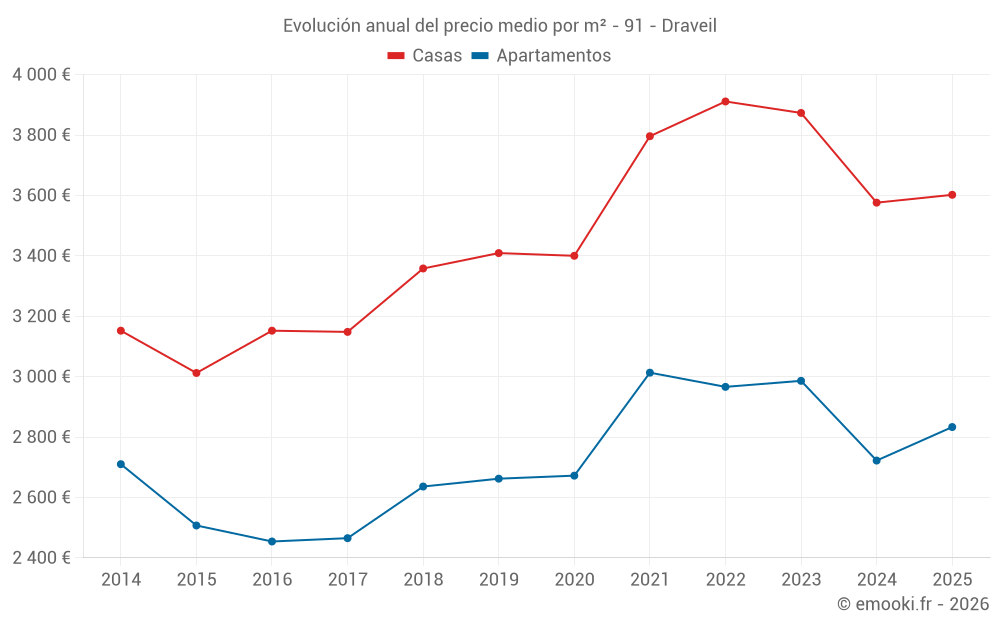 El precio mediano en las 45 transacciones de casas de los últimos 6 meses en la comuna de Draveil fue de 3 602 € por metro cuadrado para un valor patrimonial medio de 296 000 €. Durante este período el 60% de las transacciones estuvieron entre 2 765 y 4 644 € por metro cuadrado (del 2º al 8º decil).