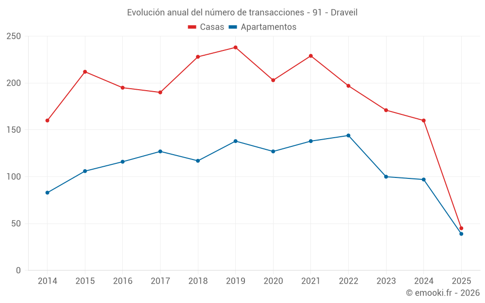 El precio mediano en las 39 transacciones de apartamentos de los últimos 6 meses en la comuna de Draveil fue de 2 833 € por metro cuadrado para un valor patrimonial medio de 165 000 €. Durante este período el 60% de las transacciones estuvieron entre 2 298 y 3 715 € por metro cuadrado (del 2º al 8º decil).