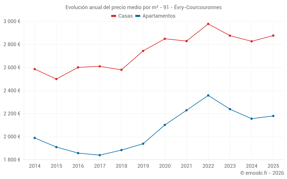 El precio mediano en las 49 transacciones de apartamentos de los últimos 3 meses en la comuna de Évry-Courcouronnes fue de 2 116 € por metro cuadrado para un valor patrimonial medio de 124 700 €. Durante este período el 60% de las transacciones estuvieron entre 1 612 y 2 864 € por metro cuadrado (del 2º al 8º decil).