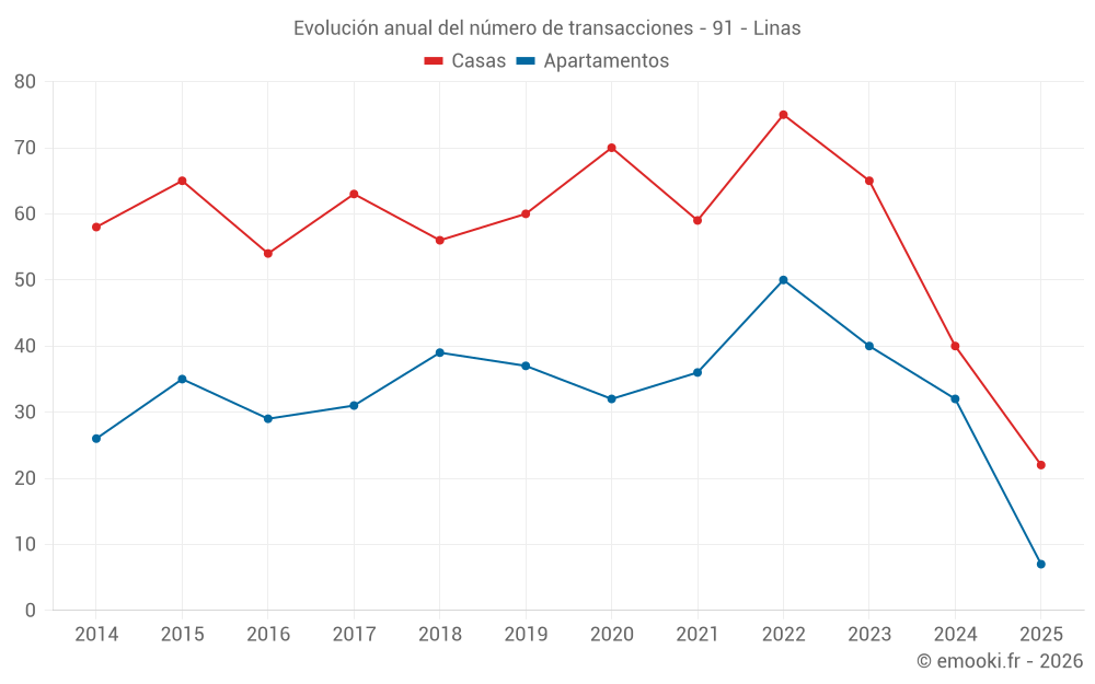 El precio mediano en las 28 transacciones de apartamentos de los últimos 12 meses en la comuna de Linas fue de 3 088 € por metro cuadrado para un valor patrimonial medio de 143 415 €. Durante este período el 60% de las transacciones estuvieron entre 2 745 y 3 543 € por metro cuadrado (del 2º al 8º decil).