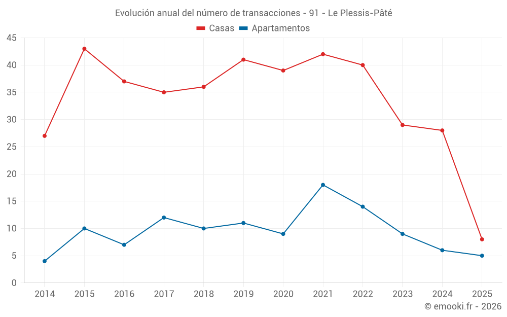 El precio mediano en las 14 transacciones de apartamentos de los últimos 24 meses en la comuna de Le Plessis-Pâté fue de 3 226 € por metro cuadrado para un valor patrimonial medio de 159 000 €. Durante este período el 60% de las transacciones estuvieron entre 2 922 y 3 814 € por metro cuadrado (del 2º al 8º decil).