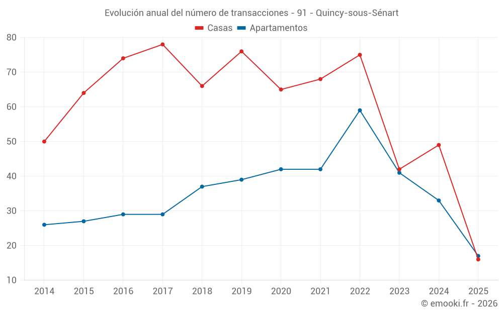 El precio mediano en las 47 transacciones de casas de los últimos 12 meses en la comuna de Quincy-sous-Sénart fue de 3 099 € por metro cuadrado para un valor patrimonial medio de 299 000 €. Durante este período el 60% de las transacciones estuvieron entre 2 529 y 3 931 € por metro cuadrado (del 2º al 8º decil).