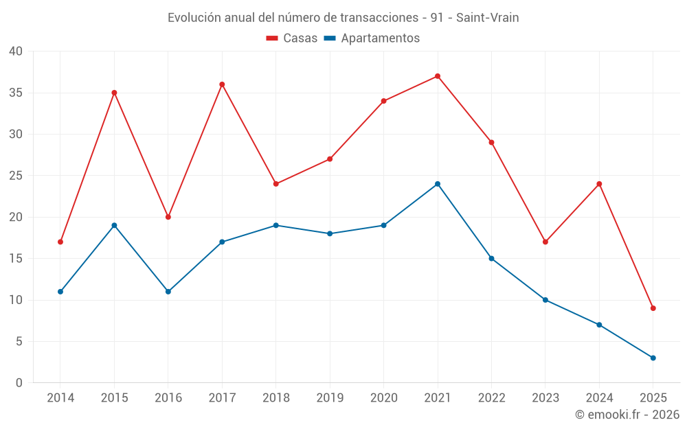 El precio mediano en las 24 transacciones de casas de los últimos 12 meses en la comuna de Saint-Vrain fue de 3 191 € por metro cuadrado para un valor patrimonial medio de 305 000 €. Durante este período el 60% de las transacciones estuvieron entre 2 652 y 3 467 € por metro cuadrado (del 2º al 8º decil).