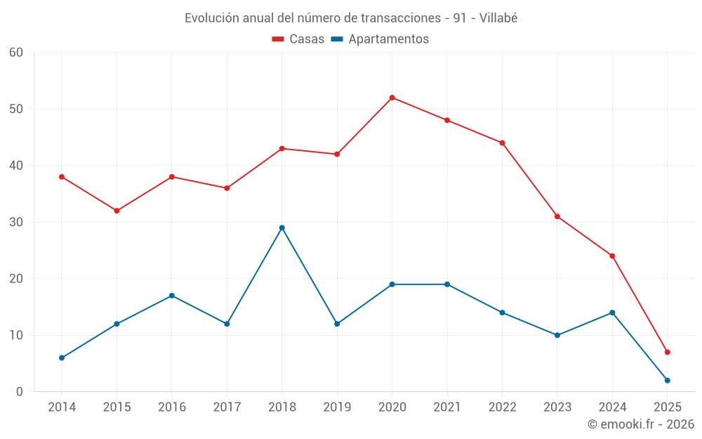 El precio mediano en las 20 transacciones de apartamentos de los últimos 24 meses en la comuna de Villabé fue de 2 911 € por metro cuadrado para un valor patrimonial medio de 138 750 €. Durante este período el 60% de las transacciones estuvieron entre 2 565 y 3 468 € por metro cuadrado (del 2º al 8º decil).