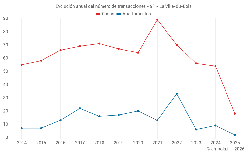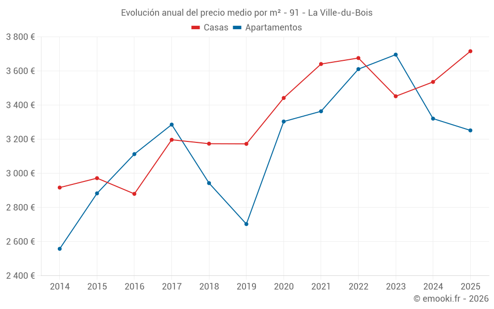 El precio mediano en las 18 transacciones de casas de los últimos 6 meses en la comuna de La Ville-du-Bois fue de 3 716 € por metro cuadrado para un valor patrimonial medio de 363 450 €. Durante este período el 60% de las transacciones estuvieron entre 3 237 y 4 681 € por metro cuadrado (del 2º al 8º decil).