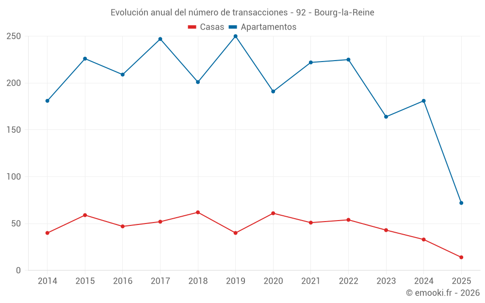 El precio mediano en las 27 transacciones de apartamentos de los últimos 3 meses en la comuna de Bourg-la-Reine fue de 5 294 € por metro cuadrado para un valor patrimonial medio de 280 000 €. Durante este período el 60% de las transacciones estuvieron entre 4 235 y 6 649 € por metro cuadrado (del 2º al 8º decil).