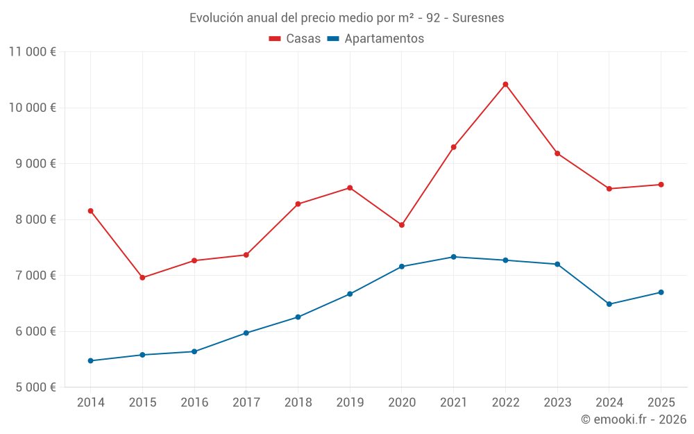 El precio mediano en las 18 transacciones de casas de los últimos 6 meses en la comuna de Suresnes fue de 8 626 € por metro cuadrado para un valor patrimonial medio de 865 000 €. Durante este período el 60% de las transacciones estuvieron entre 7 185 y 10 010 € por metro cuadrado (del 2º al 8º decil).