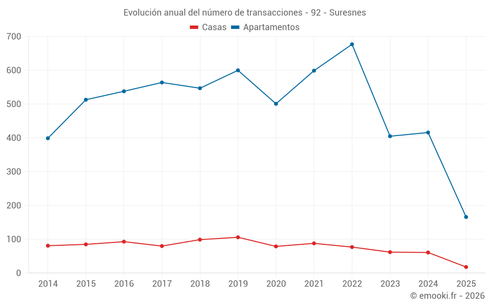 El precio mediano en las 47 transacciones de apartamentos de los últimos 3 meses en la comuna de Suresnes fue de 6 509 € por metro cuadrado para un valor patrimonial medio de 375 939 €. Durante este período el 60% de las transacciones estuvieron entre 5 000 y 7 707 € por metro cuadrado (del 2º al 8º decil).