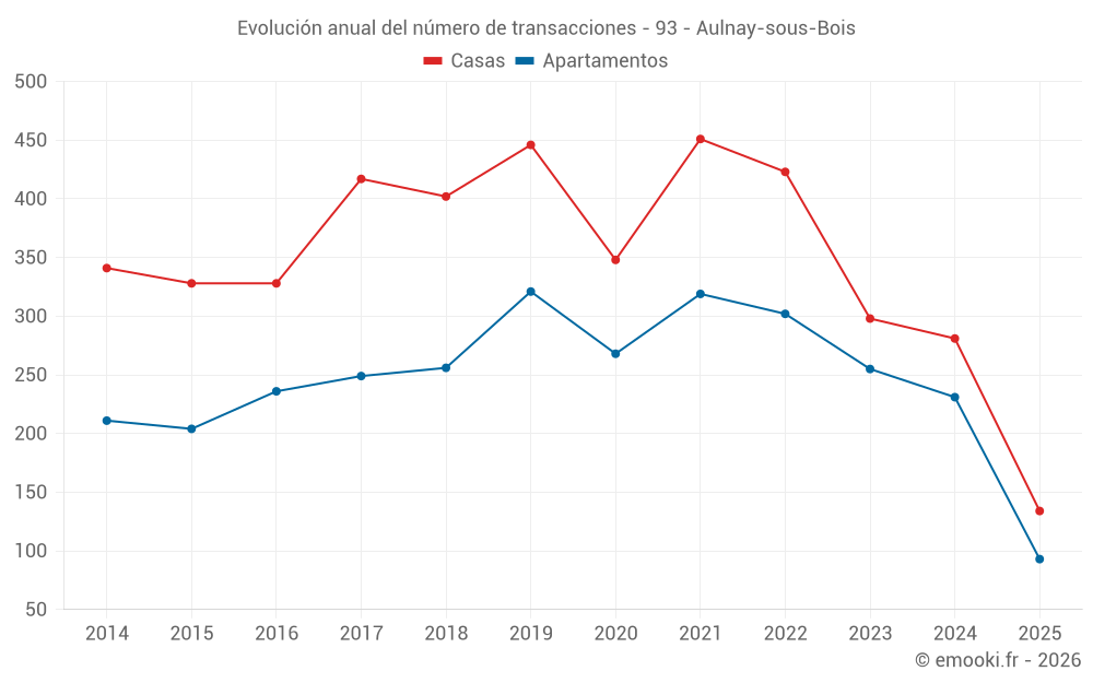 El precio mediano en las 51 transacciones de casas de los últimos 3 meses en la comuna de Aulnay-sous-Bois fue de 4 000 € por metro cuadrado para un valor patrimonial medio de 315 000 €. Durante este período el 60% de las transacciones estuvieron entre 3 196 y 5 194 € por metro cuadrado (del 2º al 8º decil).
