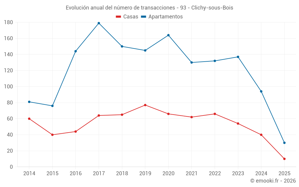 El precio mediano en las 30 transacciones de apartamentos de los últimos 6 meses en la comuna de Clichy-sous-Bois fue de 1 836 € por metro cuadrado para un valor patrimonial medio de 103 000 €. Durante este período el 60% de las transacciones estuvieron entre 1 279 y 2 276 € por metro cuadrado (del 2º al 8º decil).