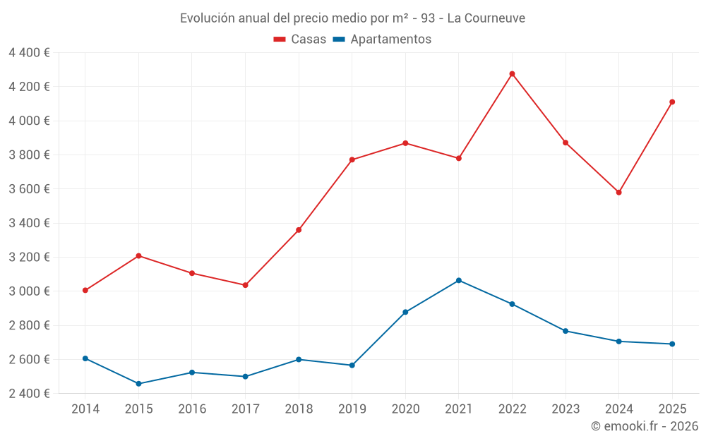 El precio mediano en las 45 transacciones de apartamentos de los últimos 6 meses en la comuna de La Courneuve fue de 2 691 € por metro cuadrado para un valor patrimonial medio de 150 000 €. Durante este período el 60% de las transacciones estuvieron entre 2 088 y 3 371 € por metro cuadrado (del 2º al 8º decil).