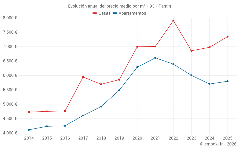 El precio mediano en las 30 transacciones de casas de los últimos 12 meses en la comuna de Pantin fue de 6 673 € por metro cuadrado para un valor patrimonial medio de 539 000 €. Durante este período el 60% de las transacciones estuvieron entre 4 354 y 9 310 € por metro cuadrado (del 2º al 8º decil).