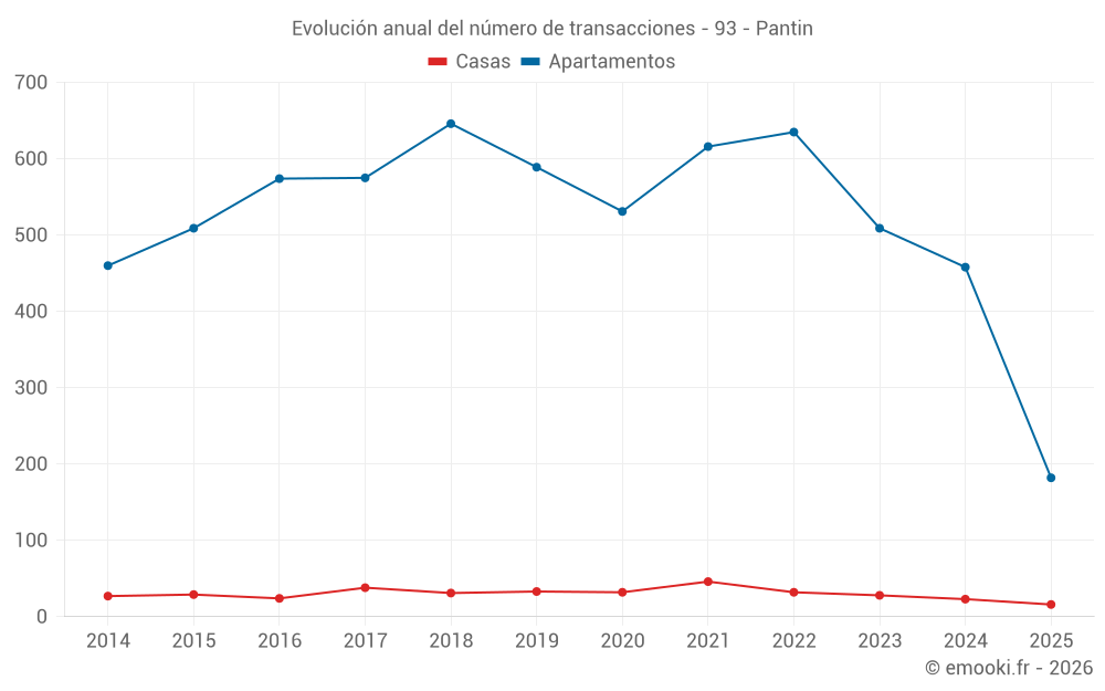El precio mediano en las 54 transacciones de apartamentos de los últimos 3 meses en la comuna de Pantin fue de 5 478 € por metro cuadrado para un valor patrimonial medio de 279 200 €. Durante este período el 60% de las transacciones estuvieron entre 3 982 y 6 569 € por metro cuadrado (del 2º al 8º decil).