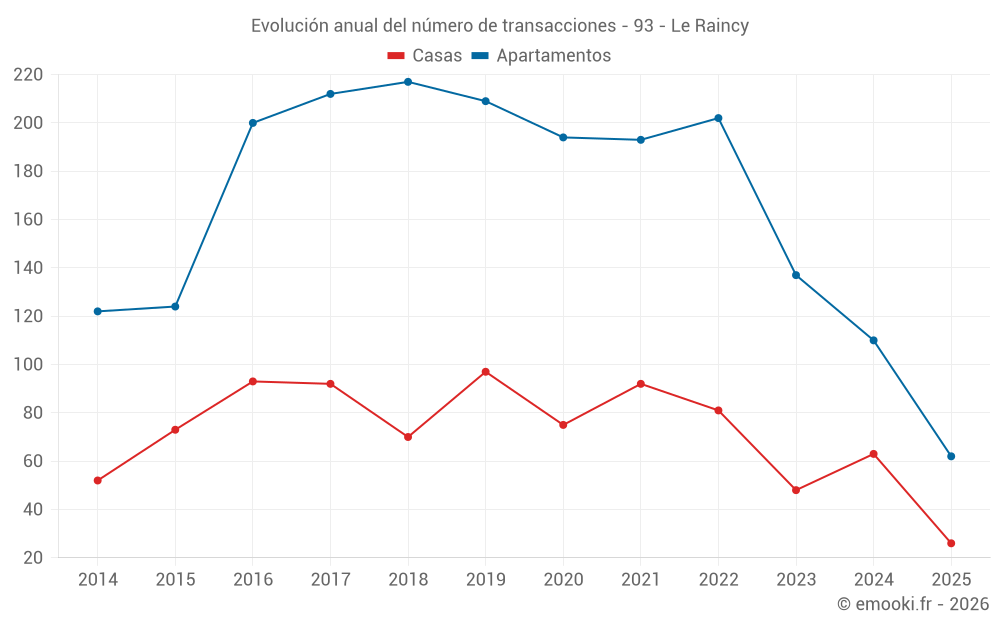 El precio mediano en las 28 transacciones de apartamentos de los últimos 3 meses en la comuna de Le Raincy fue de 3 908 € por metro cuadrado para un valor patrimonial medio de 192 500 €. Durante este período el 60% de las transacciones estuvieron entre 2 827 y 4 974 € por metro cuadrado (del 2º al 8º decil).