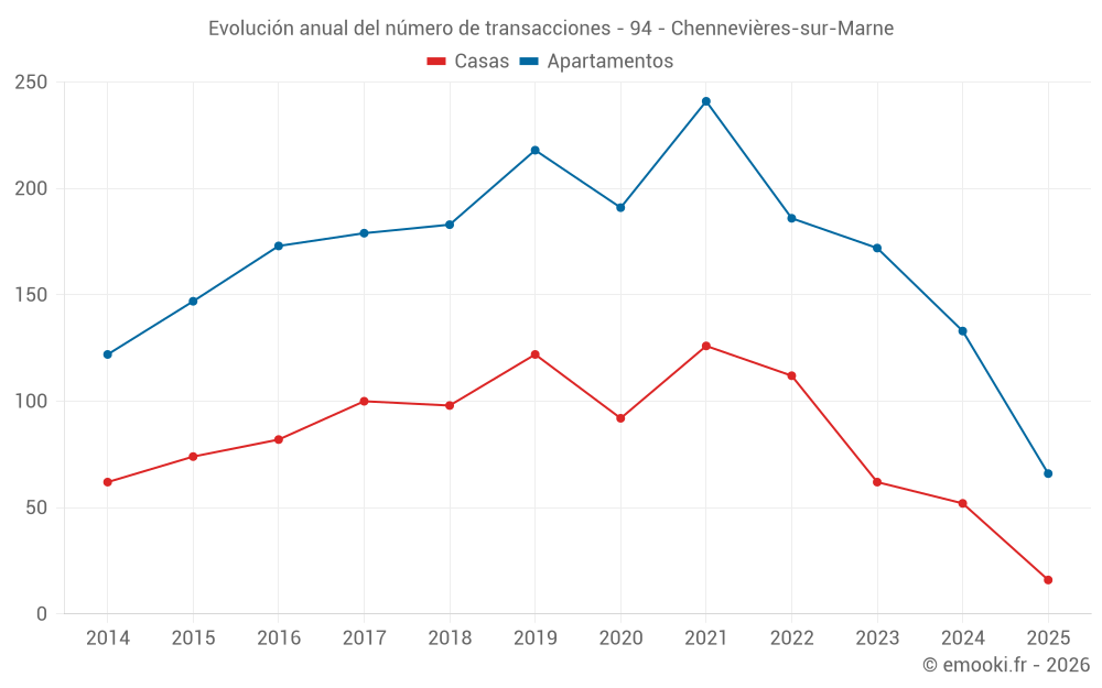El precio mediano en las 24 transacciones de apartamentos de los últimos 3 meses en la comuna de Chennevières-sur-Marne fue de 3 260 € por metro cuadrado para un valor patrimonial medio de 183 700 €. Durante este período el 60% de las transacciones estuvieron entre 2 729 y 4 632 € por metro cuadrado (del 2º al 8º decil).
