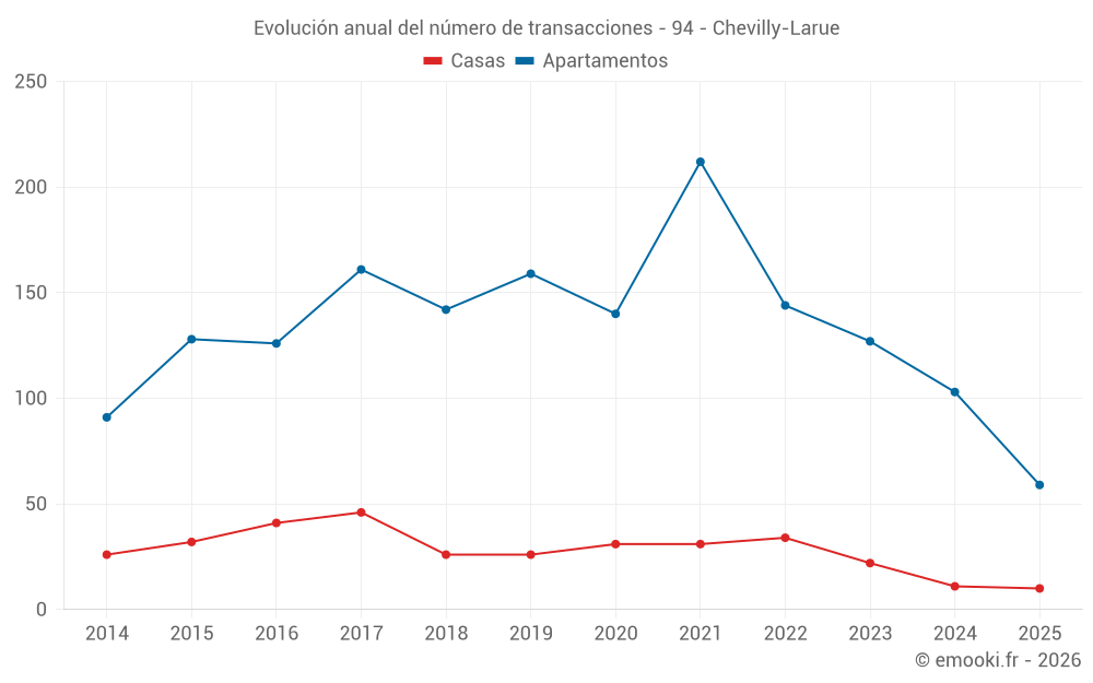 El precio mediano en las 59 transacciones de apartamentos de los últimos 6 meses en la comuna de Chevilly-Larue fue de 3 313 € por metro cuadrado para un valor patrimonial medio de 208 000 €. Durante este período el 60% de las transacciones estuvieron entre 2 748 y 4 678 € por metro cuadrado (del 2º al 8º decil).