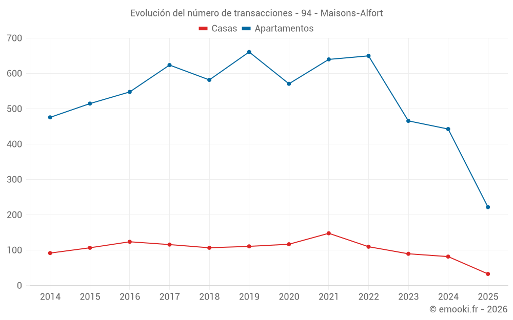 El precio mediano en las 77 transacciones de apartamentos de los últimos 3 meses en la comuna de Maisons-Alfort fue de 5 111 € por metro cuadrado para un valor patrimonial medio de 287 000 €. Durante este período el 60% de las transacciones estuvieron entre 4 083 y 6 112 € por metro cuadrado (del 2º al 8º decil).