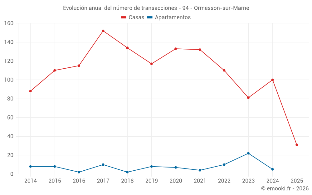 El precio mediano en las 31 transacciones de casas de los últimos 6 meses en la comuna de Ormesson-sur-Marne fue de 3 929 € por metro cuadrado para un valor patrimonial medio de 385 000 €. Durante este período el 60% de las transacciones estuvieron entre 3 584 y 4 642 € por metro cuadrado (del 2º al 8º decil).
