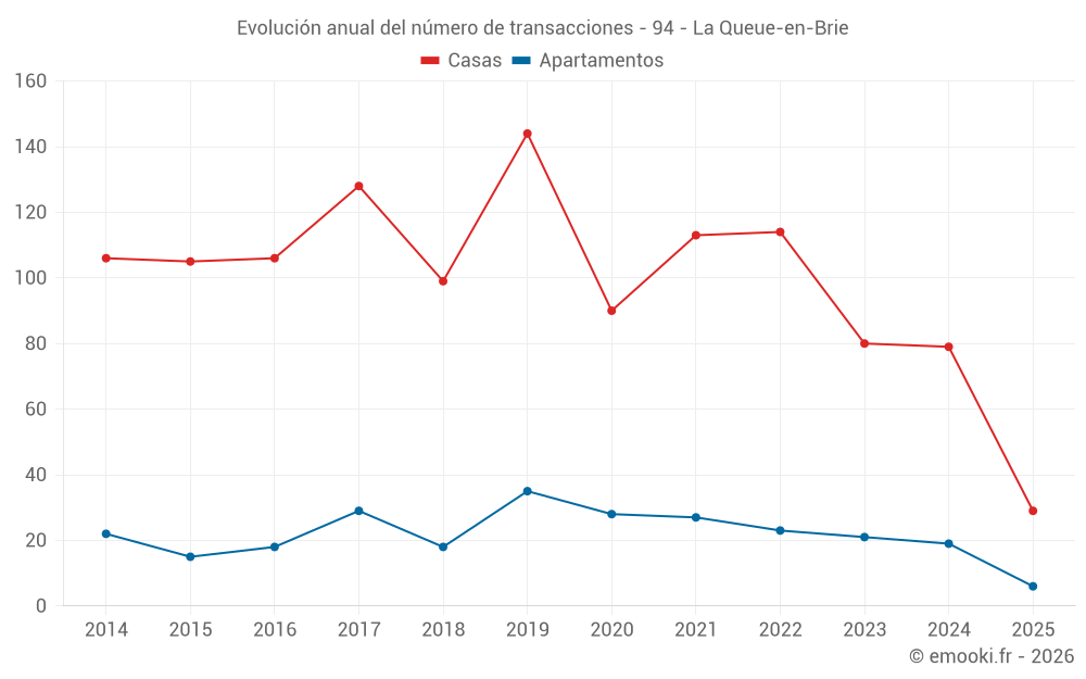 El precio mediano en las 29 transacciones de casas de los últimos 6 meses en la comuna de La Queue-en-Brie fue de 3 417 € por metro cuadrado para un valor patrimonial medio de 325 000 €. Durante este período el 60% de las transacciones estuvieron entre 3 082 y 3 921 € por metro cuadrado (del 2º al 8º decil).