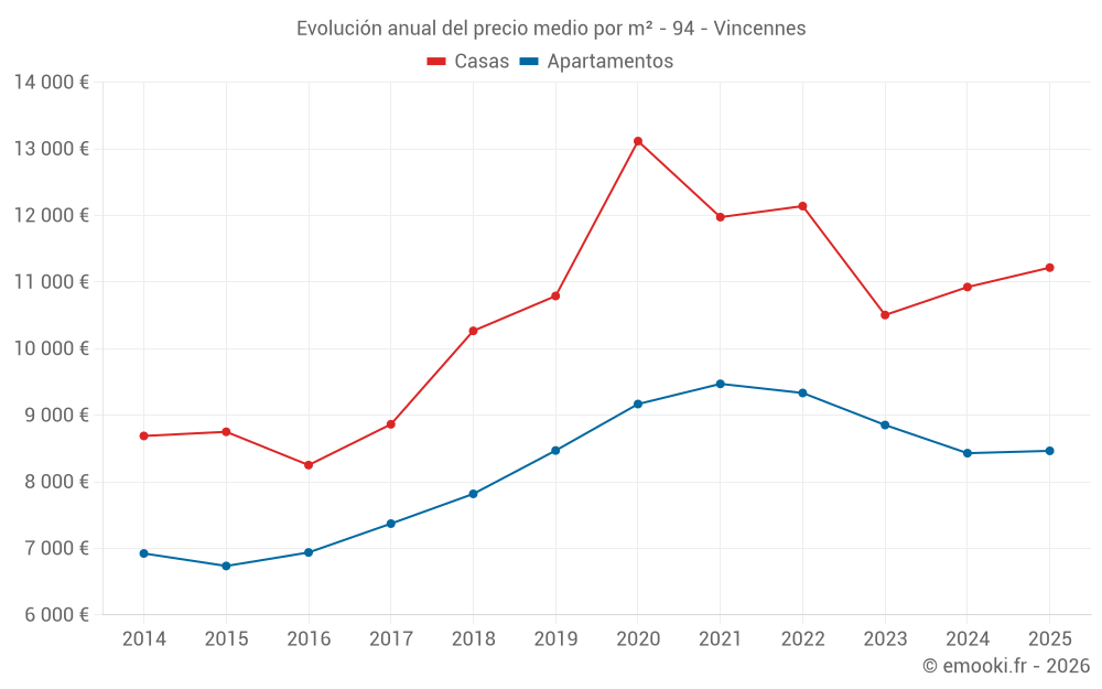 El precio mediano en las 29 transacciones de casas de los últimos 12 meses en la comuna de Vincennes fue de 11 467 € por metro cuadrado para un valor patrimonial medio de 1 261 000 €. Durante este período el 60% de las transacciones estuvieron entre 8 827 y 14 110 € por metro cuadrado (del 2º al 8º decil).