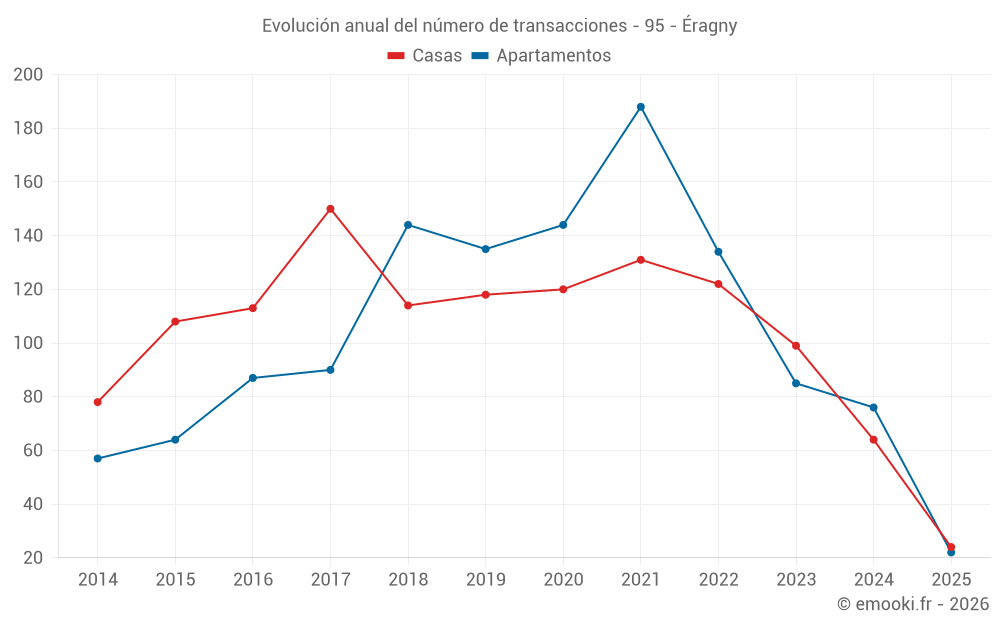 El precio mediano en las 22 transacciones de apartamentos de los últimos 6 meses en la comuna de Éragny fue de 3 260 € por metro cuadrado para un valor patrimonial medio de 159 500 €. Durante este período el 60% de las transacciones estuvieron entre 2 016 y 3 697 € por metro cuadrado (del 2º al 8º decil).