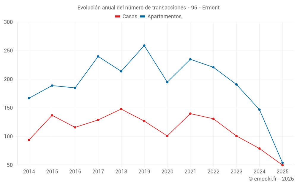 El precio mediano en las 50 transacciones de casas de los últimos 6 meses en la comuna de Ermont fue de 4 732 € por metro cuadrado para un valor patrimonial medio de 458 550 €. Durante este período el 60% de las transacciones estuvieron entre 3 727 y 6 448 € por metro cuadrado (del 2º al 8º decil).
