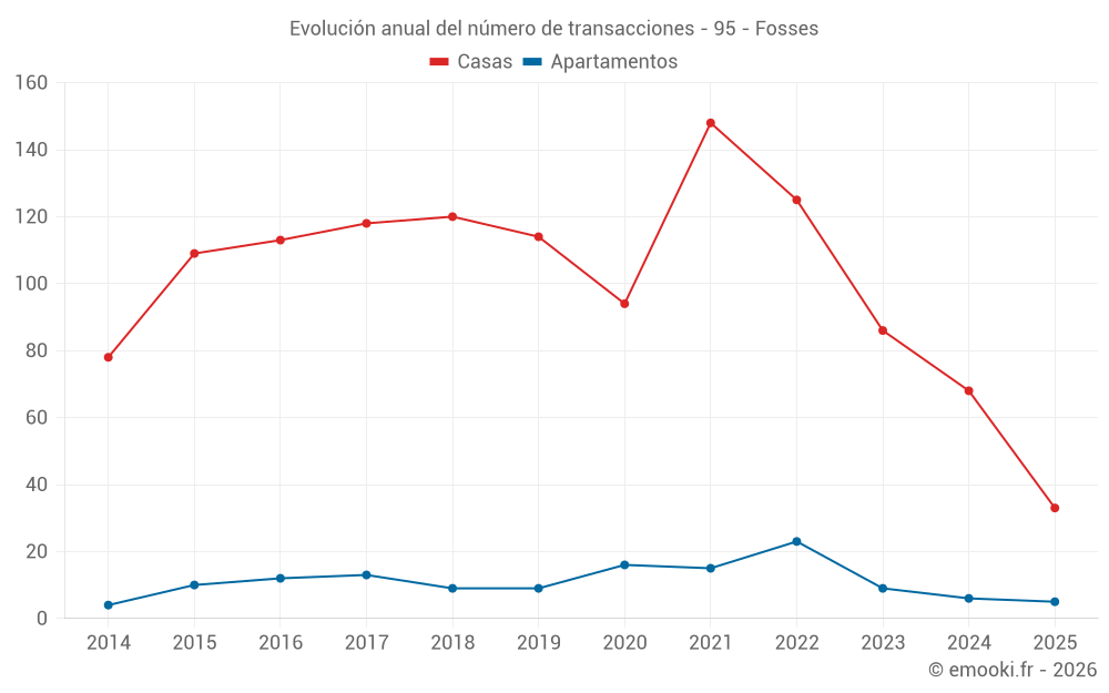 El precio mediano en las 15 transacciones de apartamentos de los últimos 24 meses en la comuna de Fosses fue de 3 600 € por metro cuadrado para un valor patrimonial medio de 163 000 €. Durante este período el 60% de las transacciones estuvieron entre 2 766 y 3 799 € por metro cuadrado (del 2º al 8º decil).